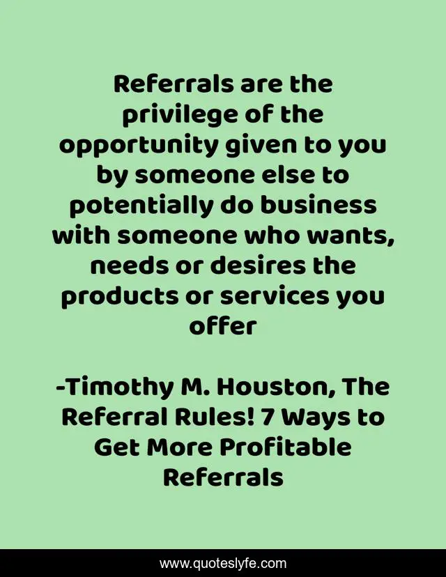 "Timothy M. Houston, The Referral Rules! 7 Ways to Get More Profitable Referrals Quotes." Quoteslyfe.com, 2025. Fri. 05 Dec. 2025. <https://www.quoteslyfe.com/quote/Referrals-are-the-privilege-of-the-opportunity-237487>.