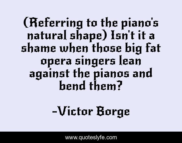 This page presents the quote "(Referring to the piano's natural shape) Isn't it a shame when those big fat opera singers lean against the pianos and bend them?". Author of this quote is Victor Borge. This quote is about funny, humor, humorous, fat, opera, borge, victor-borge, singers, piano,.