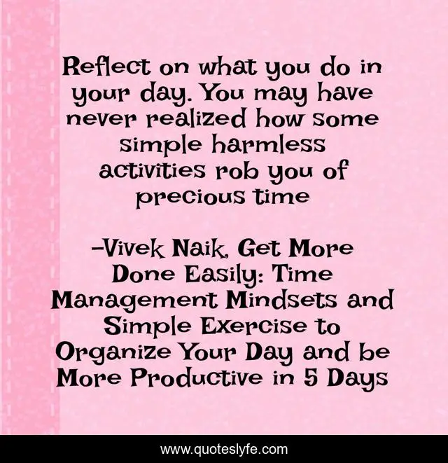 This page presents the quote "Reflect on what you do in your day. You may have never realized how some simple harmless activities rob you of precious time". Author of this quote is Vivek Naik, Get More Done Easily: Time Management Mindsets and Simple Exercise to Organize Your Day and be More Productive in 5 Days. This quote is about time-management, productivity,.