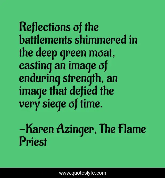 This page presents the quote "Reflections of the battlements shimmered in the deep green moat, casting an image of enduring strength, an image that defied the very siege of time.". Author of this quote is Karen Azinger, The Flame Priest. This quote is about magic, fantasy, adventure, fantasy-fiction, action, epic,.