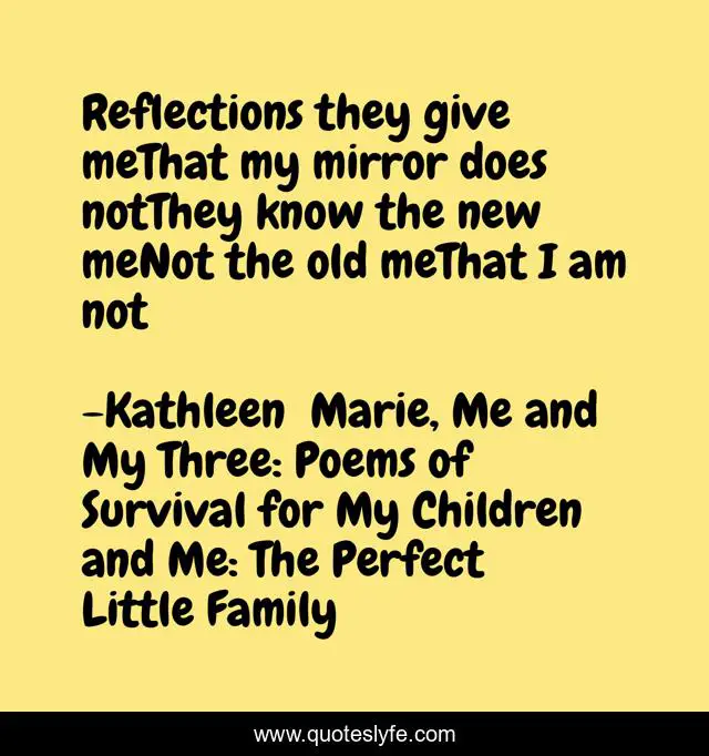 This page presents the quote "Reflections they give meThat my mirror does notThey know the new meNot the old meThat I am not". Author of this quote is Kathleen Marie, Me and My Three: Poems of Survival for My Children and Me: The Perfect Little Family. This quote is about life, family, survival, poetry, inspirational, enthusiasm,.