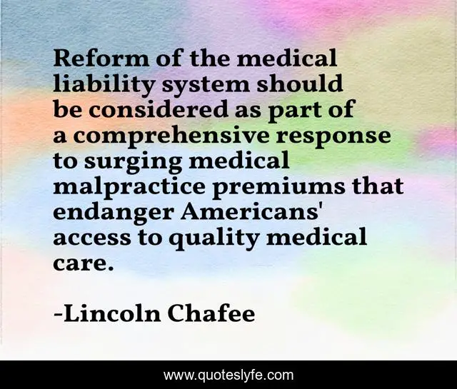 This page presents the quote "Reform of the medical liability system should be considered as part of a comprehensive response to surging medical malpractice premiums that endanger Americans' access to quality medical care.". Author of this quote is Lincoln Chafee. This quote is about quality, response, care,.