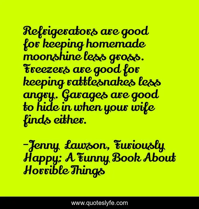 This page presents the quote "Refrigerators are good for keeping homemade moonshine less gross. Freezers are good for keeping rattlesnakes less angry. Garages are good to hide in when your wife finds either.". Author of this quote is Jenny Lawson, Furiously Happy: A Funny Book About Horrible Things. This quote is about gross, humor, jenny-lawson, wife, moonshine, angry, rattlesnake, garage, hide,.