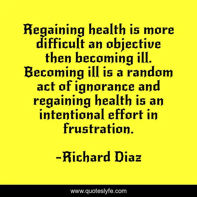 This page presents the quote "Regaining health is more difficult an objective then becoming ill. Becoming ill is a random act of ignorance and regaining health is an intentional effort in frustration.". Author of this quote is Richard Diaz. This quote is about illness, health,.