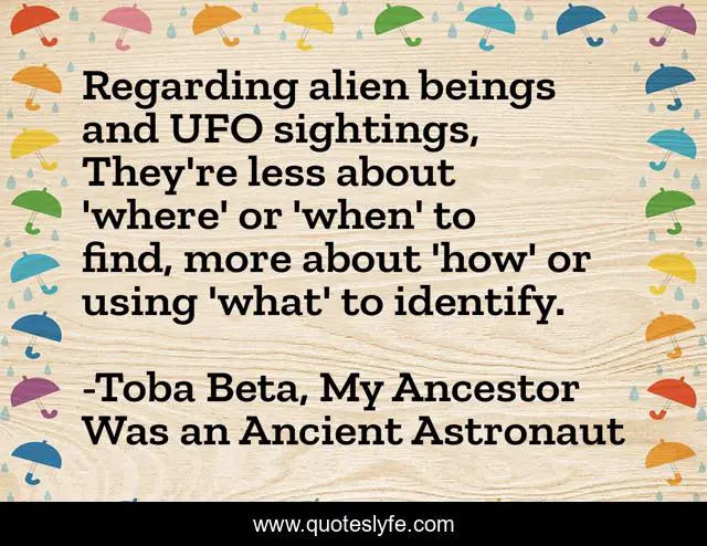 "Toba Beta, My Ancestor Was an Ancient Astronaut Quotes." Quoteslyfe.com, 2025. Fri. 05 Dec. 2025. <https://www.quoteslyfe.com/quote/Regarding-alien-beings-and-UFO-sightings-They-10619>.