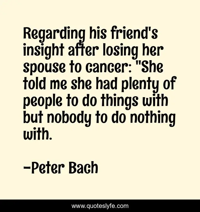 This page presents the quote "Regarding his friend's insight after losing her spouse to cancer: "She told me she had plenty of people to do things with but nobody to do nothing with.". Author of this quote is Peter Bach. This quote is about cancer-doctor, cancer, lying-honorably,.