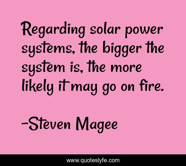 This page presents the quote "Regarding solar power systems, the bigger the system is, the more likely it may go on fire.". Author of this quote is Steven Magee. This quote is about photovoltaic, pv, power, fire, energy, regarding, may, likely, systems,.