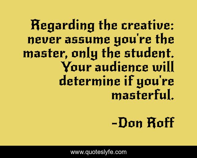 This page presents the quote "Regarding the creative: never assume you're the master, only the student. Your audience will determine if you're masterful.". Author of this quote is Don Roff. This quote is about life, art, assume, tip, masterful, zen, creative, audience, master,.