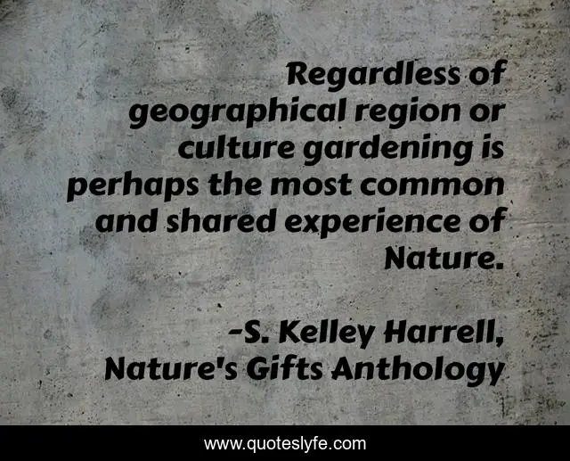 "S. Kelley Harrell, Nature's Gifts Anthology Quotes." Quoteslyfe.com, 2025. Sat. 06 Dec. 2025. <https://www.quoteslyfe.com/quote/Regardless-of-geographical-region-or-culture-gardening-44149>.