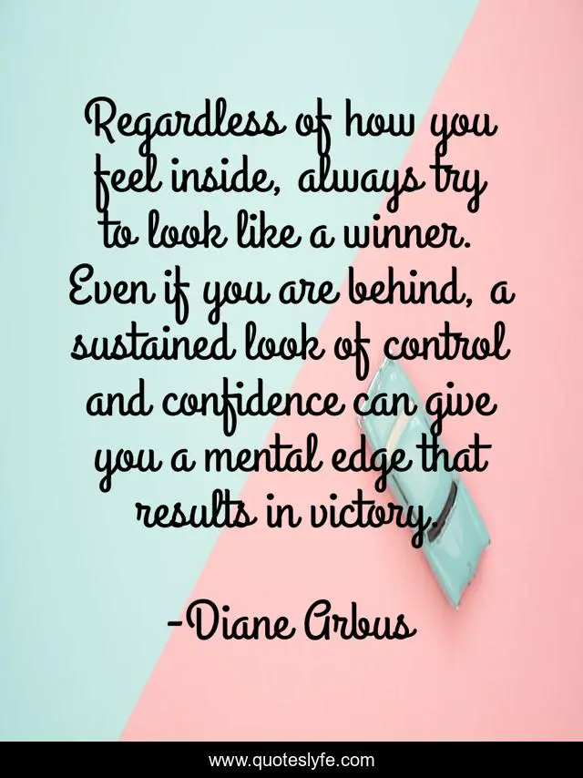 This page presents the quote "Regardless of how you feel inside, always try to look like a winner. Even if you are behind, a sustained look of control and confidence can give you a mental edge that results in victory.". Author of this quote is Diane Arbus. This quote is about control, mental-edge, confidence, inside, winner, results, behind, how-you-feel, victory,.