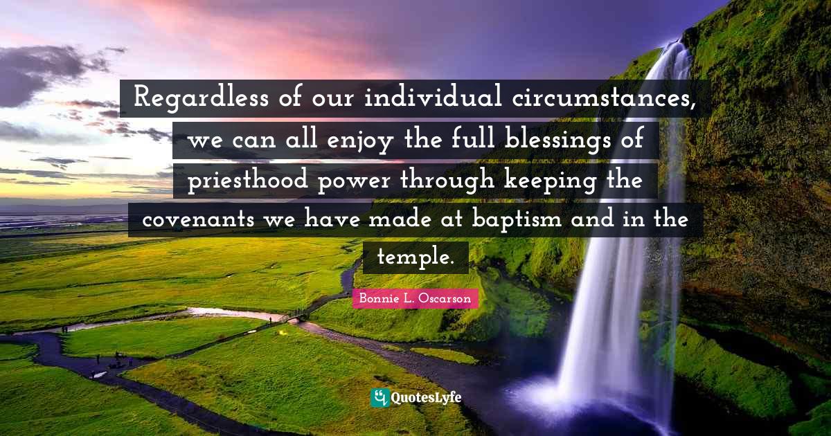 This page presents the quote "Regardless of our individual circumstances, we can all enjoy the full blessings of priesthood power through keeping the covenants we have made at baptism and in the temple.". Author of this quote is Bonnie L. Oscarson. This quote is about priesthood, covenant, individual, power, enjoy, circumstances, baptism, made, blessing,.