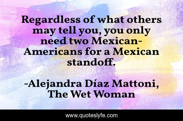 This page presents the quote "Regardless of what others may tell you, you only need two Mexican-Americans for a Mexican standoff.". Author of this quote is Alejandra Díaz Mattoni, The Wet Woman. This quote is about beingmexican, humor, fighting,.