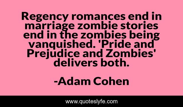 This page presents the quote "Regency romances end in marriage zombie stories end in the zombies being vanquished. 'Pride and Prejudice and Zombies' delivers both.". Author of this quote is Adam Cohen. This quote is about end, pride, prejudice,.