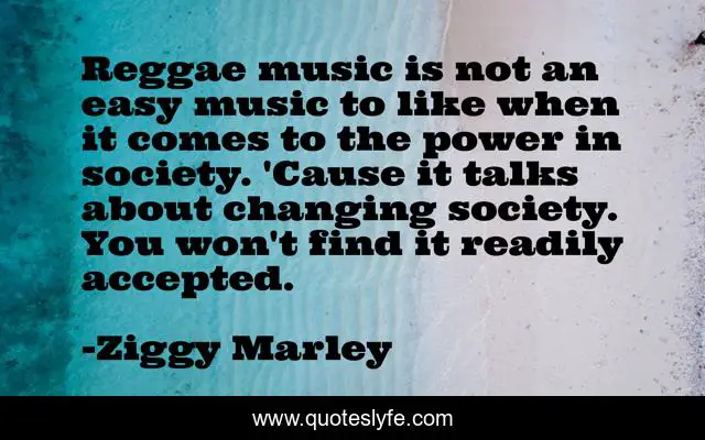 This page presents the quote "Reggae music is not an easy music to like when it comes to the power in society. 'Cause it talks about changing society. You won't find it readily accepted.". Author of this quote is Ziggy Marley. This quote is about music, power, easy,.