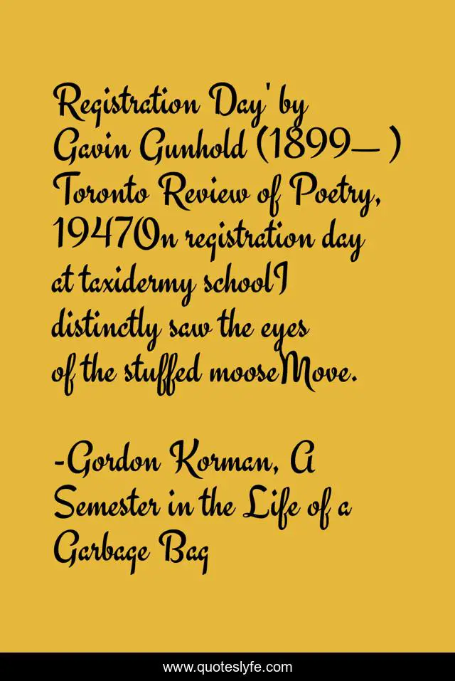 "Gordon Korman, A Semester in the Life of a Garbage Bag Quotes." Quoteslyfe.com, 2025. Mon. 08 Dec. 2025. <https://www.quoteslyfe.com/quote/Registration-Day-by-Gavin-Gunhold-1899-Toronto-208601>.
