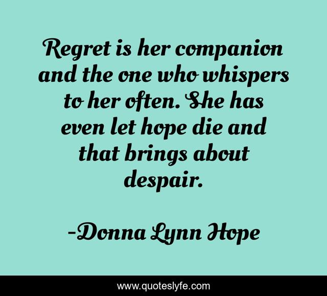 This page presents the quote "Regret is her companion and the one who whispers to her often. She has even let hope die and that brings about despair.". Author of this quote is Donna Lynn Hope. This quote is about despair, regret, depression,.