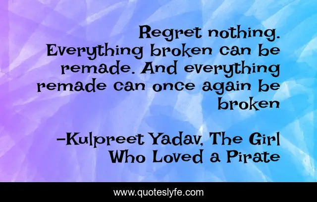 "Kulpreet Yadav, The Girl Who Loved a Pirate Quotes." Quoteslyfe.com, 2025. Fri. 05 Dec. 2025. <https://www.quoteslyfe.com/quote/Regret-nothing-Everything-broken-can-be-remade-215166>.