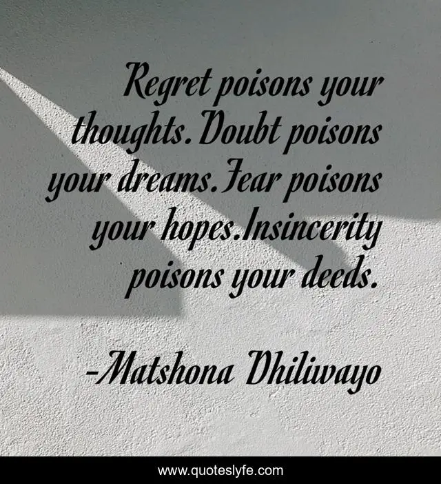 "Matshona Dhiliwayo Quotes." Quoteslyfe.com, 2025. Fri. 05 Dec. 2025. <https://www.quoteslyfe.com/quote/Regret-poisons-your-thoughts-Doubt-poisons-your-207542>.