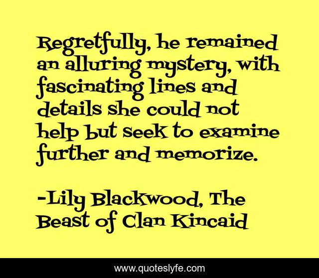 This page presents the quote "Regretfully, he remained an alluring mystery, with fascinating lines and details she could not help but seek to examine further and memorize.". Author of this quote is Lily Blackwood, The Beast of Clan Kincaid. This quote is about romance, romance-novels, scotland, scottish-romance,.
