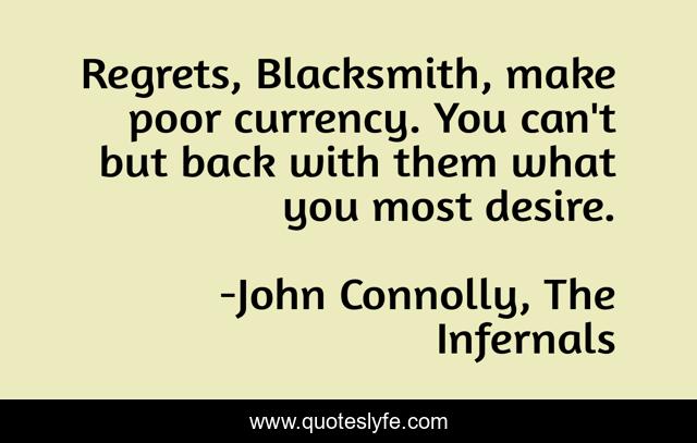 This page presents the quote "Regrets, Blacksmith, make poor currency. You can't but back with them what you most desire.". Author of this quote is John Connolly, The Infernals. This quote is about desire, regretful, regrets, regret,.