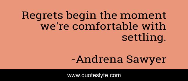 This page presents the quote "Regrets begin the moment we're comfortable with settling.". Author of this quote is Andrena Sawyer. This quote is about career, giving-up, relationship, regret, second-chances,.