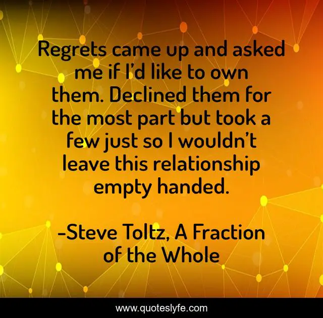 This page presents the quote "Regrets came up and asked me if I’d like to own them. Declined them for the most part but took a few just so I wouldn’t leave this relationship empty handed.". Author of this quote is Steve Toltz, A Fraction of the Whole. This quote is about relationships, regret,.