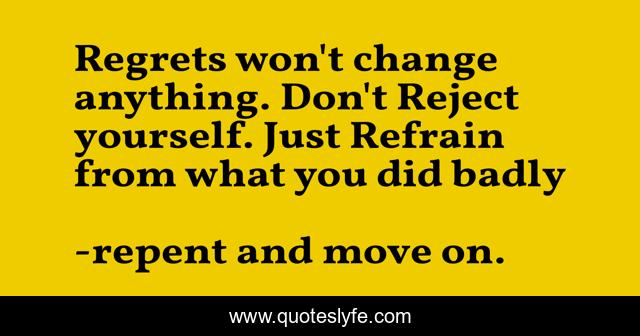 This page presents the quote "Regrets won't change anything. Don't Reject yourself. Just Refrain from what you did badly". Author of this quote is repent and move on.. This quote is about israelmore ayivor, dream big!: see your bigger picture!,.