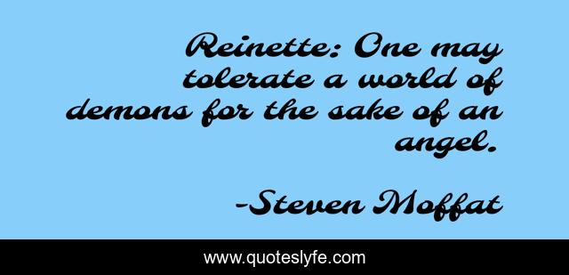 This page presents the quote "Reinette: One may tolerate a world of demons for the sake of an angel.". Author of this quote is Steven Moffat. This quote is about reinette, angel, doctor, madame-du-pompadour, demons, girl-in-the-fireplace, doctor-who, tolerance,.