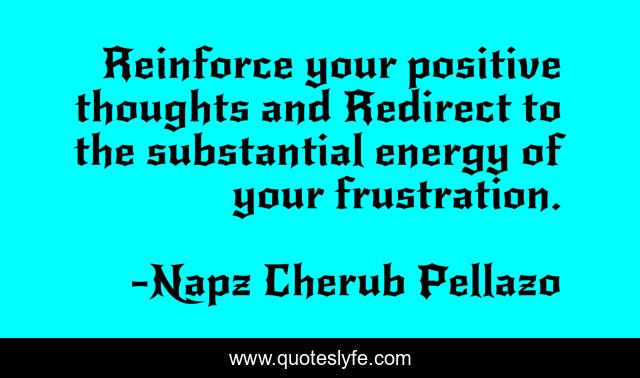 This page presents the quote "Reinforce your positive thoughts and Redirect to the substantial energy of your frustration.". Author of this quote is Napz Cherub Pellazo. This quote is about uplifting, inspirational, positive-energy, positive-thoughts, enthusiasm, enlightenment,.