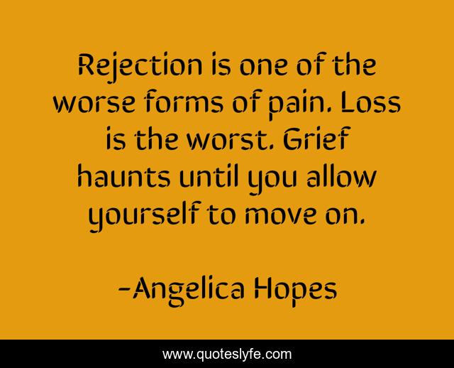 This page presents the quote "Rejection is one of the worse forms of pain. Loss is the worst. Grief haunts until you allow yourself to move on.". Author of this quote is Angelica Hopes. This quote is about loss, pain, sorrow, grief, frustration, moving-on,.