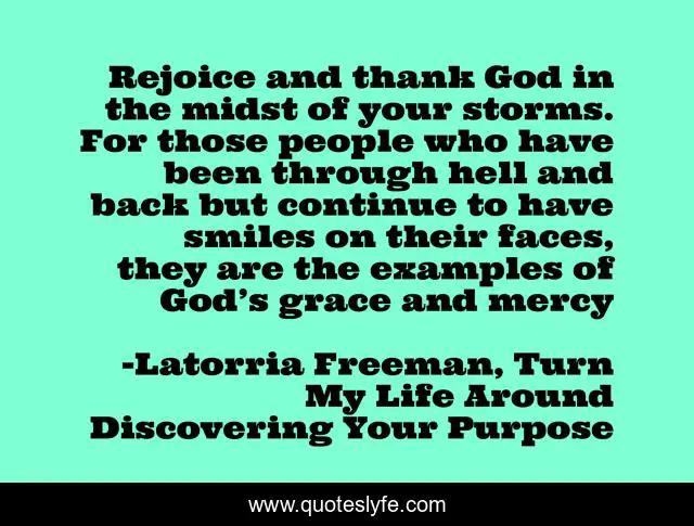 This page presents the quote "Rejoice and thank God in the midst of your storms. For those people who have been through hell and back but continue to have smiles on their faces, they are the examples of God’s grace and mercy". Author of this quote is Latorria Freeman, Turn My Life Around Discovering Your Purpose. This quote is about enthusiasm, christianity, inspirational, mercy-of-god,.