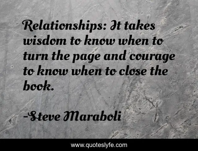 This page presents the quote "Relationships: It takes wisdom to know when to turn the page and courage to know when to close the book.". Author of this quote is Steve Maraboli. This quote is about relationships, courage, love, affection, wisdom,.