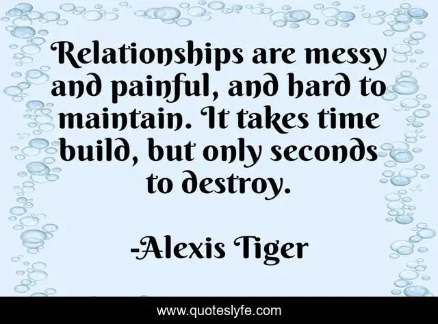 This page presents the quote "Relationships are messy and painful, and hard to maintain. It takes time build, but only seconds to destroy.". Author of this quote is Alexis Tiger. This quote is about relationships, pain, thought-provoking,.