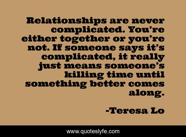 This page presents the quote "Relationships are never complicated. You’re either together or you’re not. If someone says it’s complicated, it really just means someone’s killing time until something better comes along.". Author of this quote is Teresa Lo. This quote is about relationships, lovers, love, unrequited-love, affection,.