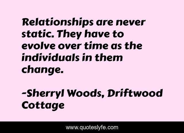 This page presents the quote "Relationships are never static. They have to evolve over time as the individuals in them change.". Author of this quote is Sherryl Woods, Driftwood Cottage. This quote is about relationships, enthusiasm, inspirational, life-lessons,.