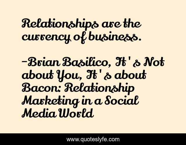 "Brian Basilico, It's Not about You, It's about Bacon: Relationship Marketing in a Social Media World Quotes." Quoteslyfe.com, 2025. Fri. 05 Dec. 2025. <https://www.quoteslyfe.com/quote/Relationships-are-the-currency-of-business-237551>.