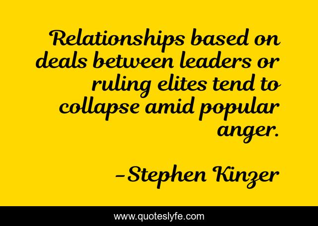 This page presents the quote "Relationships based on deals between leaders or ruling elites tend to collapse amid popular anger.". Author of this quote is Stephen Kinzer. This quote is about relationships, leaders,.
