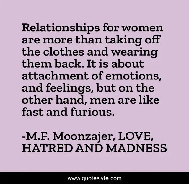 This page presents the quote "Relationships for women are more than taking off the clothes and wearing them back. It is about attachment of emotions, and feelings, but on the other hand, men are like fast and furious.". Author of this quote is M.F. Moonzajer, LOVE, HATRED AND MADNESS. This quote is about relationships, men, emotions, women, fast, furious, feeling, attachment,.