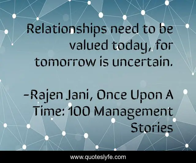 "Rajen Jani, Once Upon A Time: 100 Management Stories Quotes." Quoteslyfe.com, 2025. Sat. 06 Dec. 2025. <https://www.quoteslyfe.com/quote/Relationships-need-to-be-valued-today-for-31250>.