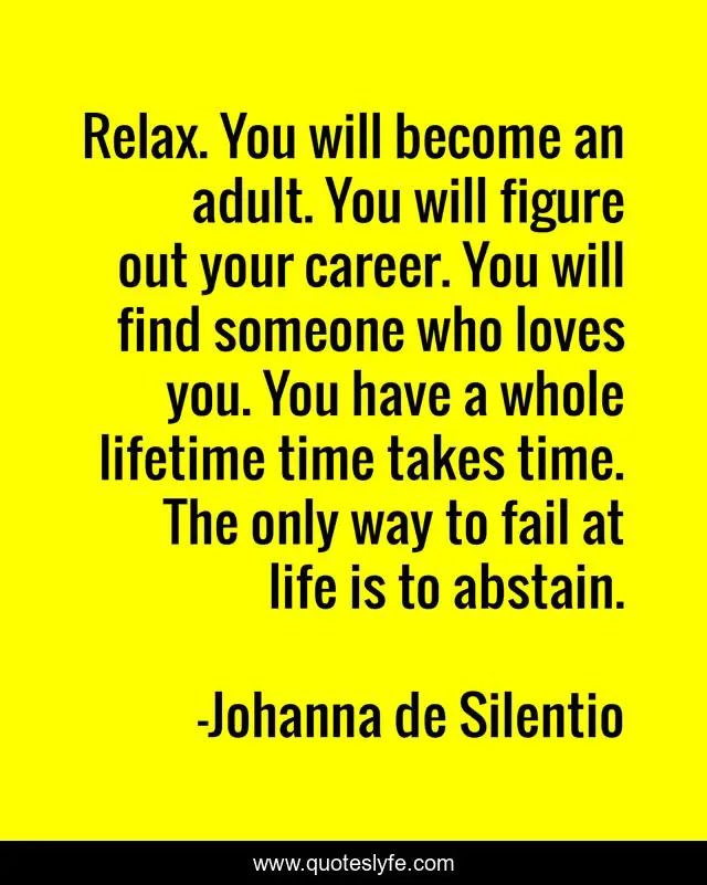 This page presents the quote "Relax. You will become an adult. You will figure out your career. You will find someone who loves you. You have a whole lifetime time takes time. The only way to fail at life is to abstain.". Author of this quote is Johanna de Silentio. This quote is about enthusiasm, adulthood, growing-up, life-lessons, inspirational,.