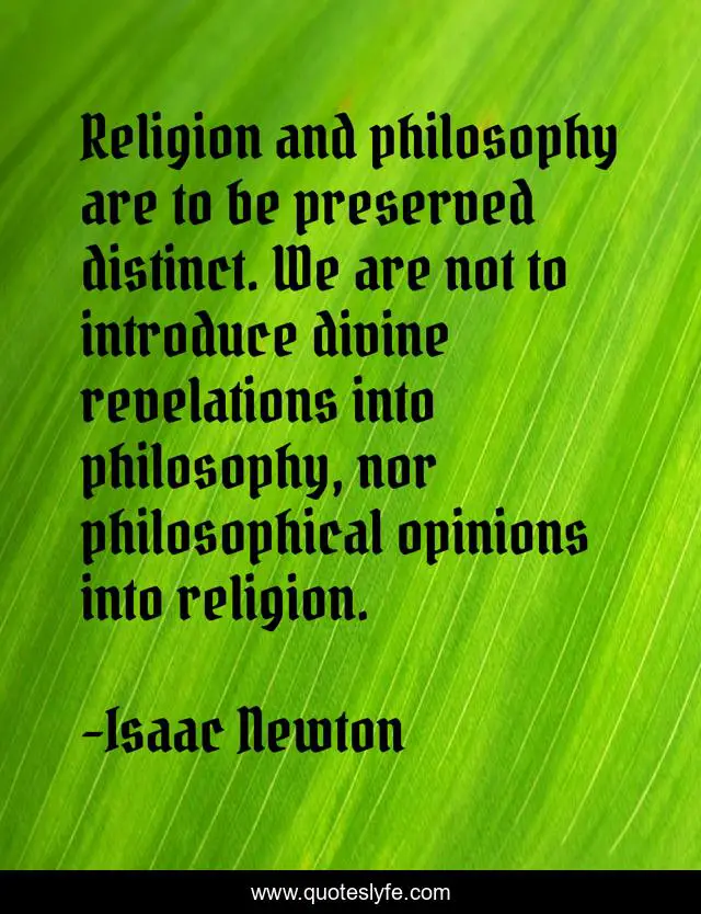 This page presents the quote "Religion and philosophy are to be preserved distinct. We are not to introduce divine revelations into philosophy, nor philosophical opinions into religion.". Author of this quote is Isaac Newton. This quote is about opinions, philosophy, divine,.