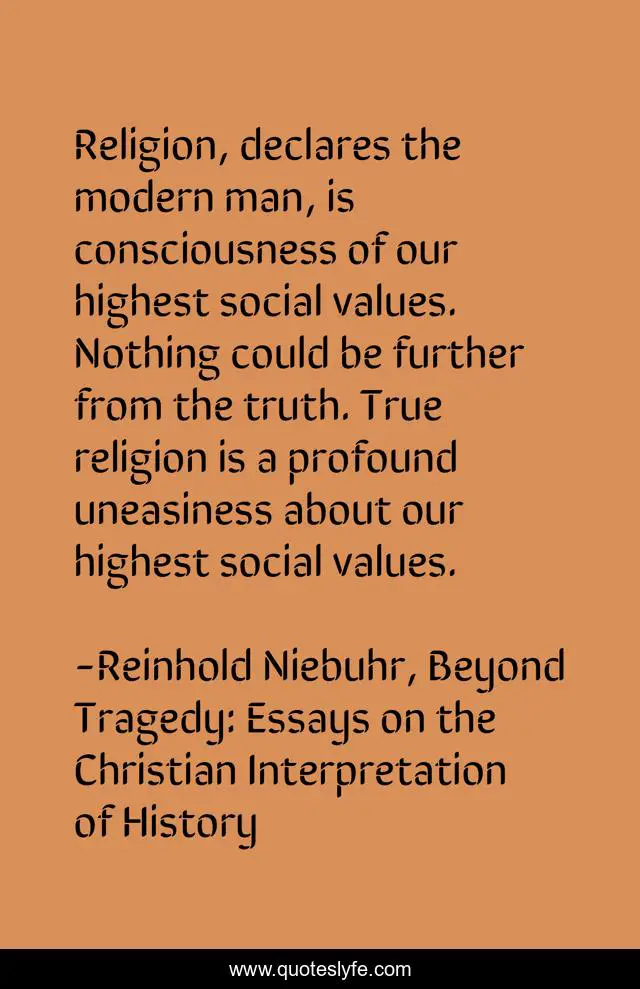 "Reinhold Niebuhr, Beyond Tragedy: Essays on the Christian Interpretation of History Quotes." Quoteslyfe.com, 2025. Mon. 29 Dec. 2025. <https://www.quoteslyfe.com/quote/Religion-declares-the-modern-man-is-consciousness-30110>.