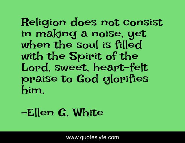 This page presents the quote "Religion does not consist in making a noise, yet when the soul is filled with the Spirit of the Lord, sweet, heart-felt praise to God glorifies him.". Author of this quote is Ellen G. White. This quote is about god, soul, sweet,.