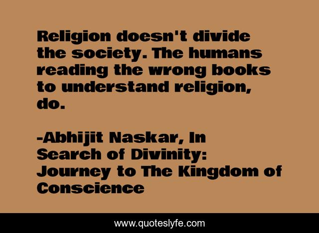This page presents the quote "Religion doesn't divide the society. The humans reading the wrong books to understand religion, do.". Author of this quote is Abhijit Naskar, In Search of Divinity: Journey to The Kingdom of Conscience. This quote is about wise, pearls-of-wisdom, religious-violence, philosophy, religious-diversity, religious-tolerance, religious-freedom, religious-extremism, inspirational,.