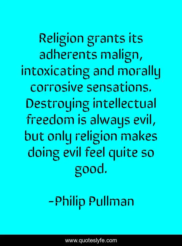This page presents the quote "Religion grants its adherents malign, intoxicating and morally corrosive sensations. Destroying intellectual freedom is always evil, but only religion makes doing evil feel quite so good.". Author of this quote is Philip Pullman. This quote is about freedom-of-speech, freedom, evil, hubris, religion, censorship, first-amendment,.