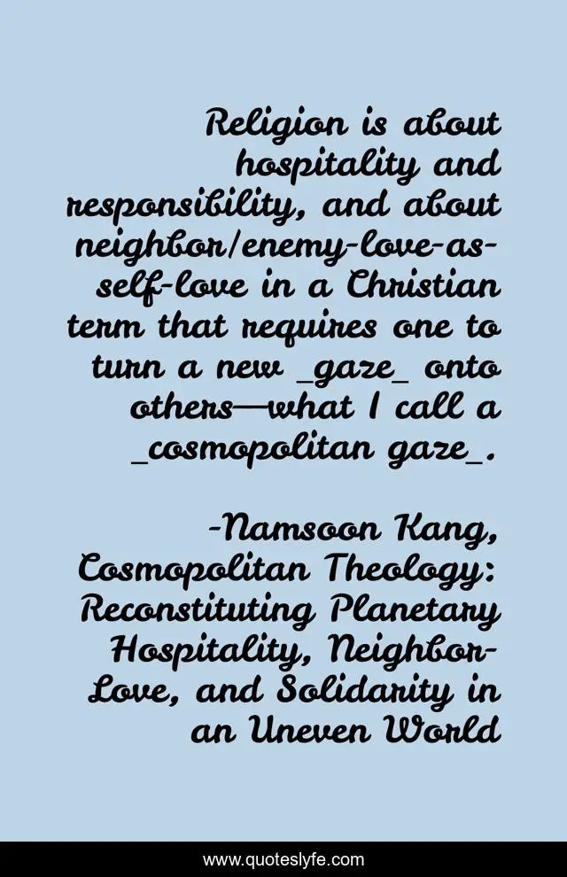 This page presents the quote "Religion is about hospitality and responsibility, and about neighbor/enemy-love-as-self-love in a Christian term that requires one to turn a new _gaze_ onto others––what I call a _cosmopolitan gaze_.". Author of this quote is Namsoon Kang, Cosmopolitan Theology: Reconstituting Planetary Hospitality, Neighbor-Love, and Solidarity in an Uneven World. This quote is about cosmopolitanism, love, christianity, religion, hospitality, cosmopolitan, theology, affection,.