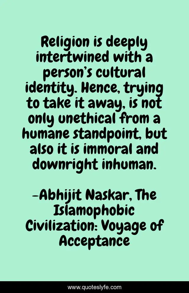 This page presents the quote "Religion is deeply intertwined with a person’s cultural identity. Hence, trying to take it away, is not only unethical from a humane standpoint, but also it is immoral and downright inhuman.". Author of this quote is Abhijit Naskar, The Islamophobic Civilization: Voyage of Acceptance. This quote is about love, religious-faith, brainy, optimistic, religious, neurotheology, inspiring, positive, science-and-religion,.