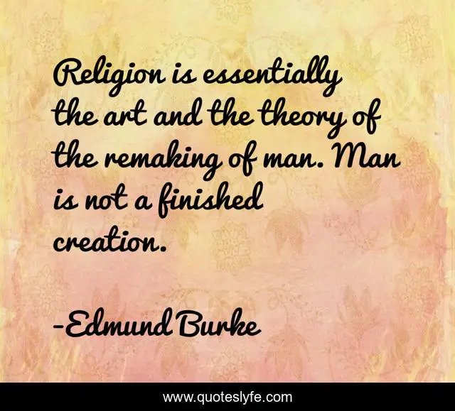 This page presents the quote "Religion is essentially the art and the theory of the remaking of man. Man is not a finished creation.". Author of this quote is Edmund Burke. This quote is about creation, art, man,.