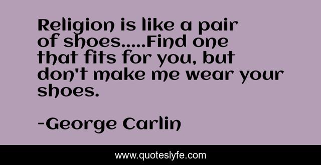 This page presents the quote "Religion is like a pair of shoes.....Find one that fits for you, but don't make me wear your shoes.". Author of this quote is George Carlin. This quote is about religion, evangelism, tolerance, freedom-of-religion,.