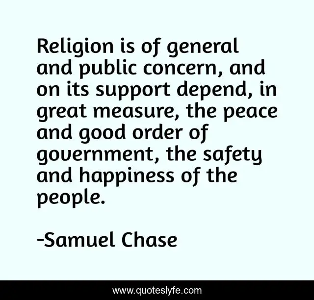 This page presents the quote "Religion is of general and public concern, and on its support depend, in great measure, the peace and good order of government, the safety and happiness of the people.". Author of this quote is Samuel Chase. This quote is about good, peace, happiness,.